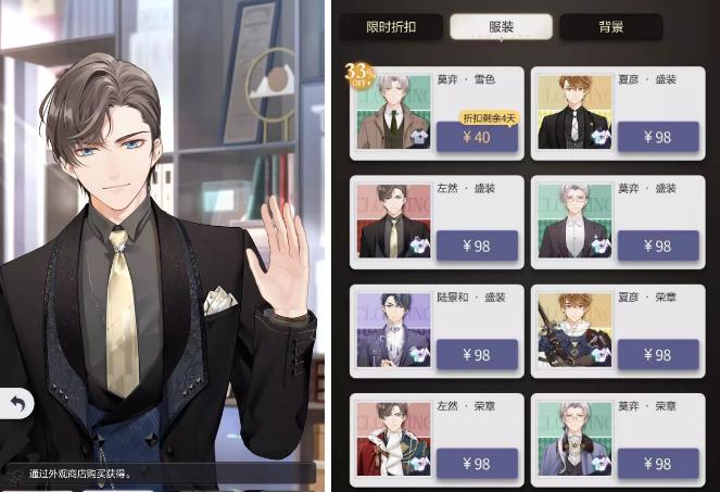 更重要的是,这部分乙游的定价相对亲民,折扣活动期间,可指定男主单套外观贩售价格在30-70元区间浮动。