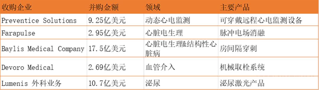 2014年,收购了拜耳介入业务,帮助公司加强外周介入业务,加速外周旋切和血栓切除领域业务的增长;收购 AMS 的泌尿产品组合,扩充公司泌尿业务,巩固在该领域的全球领先地位;收购瓣膜公司 NeoVasc,收购心脏瓣膜制造商 Symetis 及电生理射频消融球囊 Apama;收购 Cosman Medical,提供一系列脊髓刺激系统以治疗慢性疼痛患者;2018 年相继收购了 BTG 肿瘤介入业务、nxthera 前列腺治疗业务、EMcision 内镜下射频消融业务、milipede 经导管二尖瓣臵换业务、Cryterion 电生理冷冻球囊业务、Veiniti 外周介入器械中静脉治疗产品、介入医学 BTG等。仅在2018年,波士顿科学就收购了10家公司。