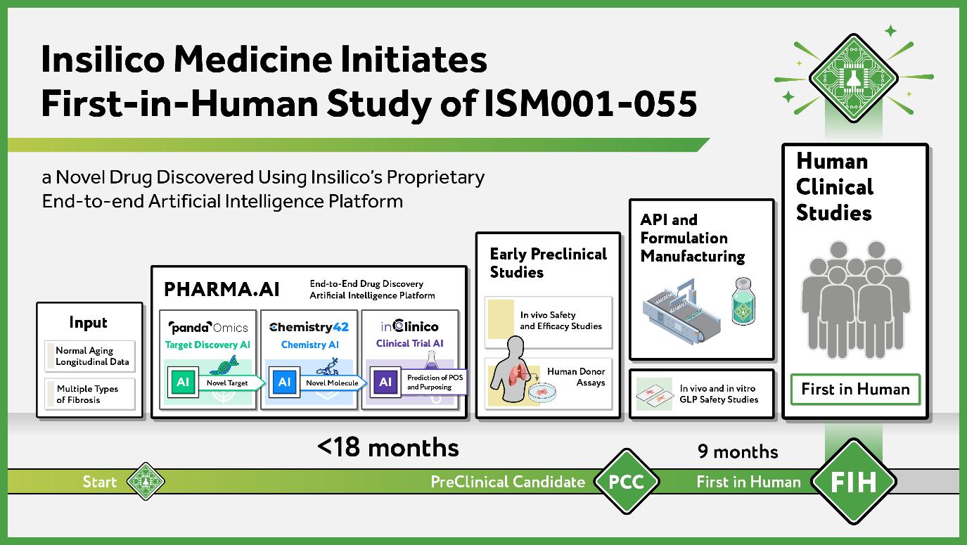 去年年底,英矽智能宣布在ISM001-055的首次微剂量人体试验中,完成第一个健康志愿者的临床给药案例。ISM001-055是由英矽智能端到端人工智能药物研发平台所发现的候选药物,这是一种具有全球首创新药潜力、针对全新靶点的全新小分子抑制剂,正在被开发用于治疗特发性肺纤维化(IPF)── 一种慢性肺部疾病。
