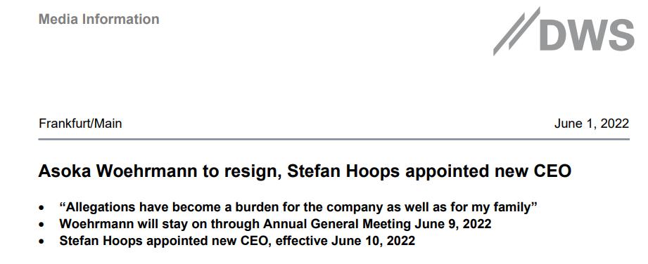 虽然Fixler败诉,但这一诉讼案得到了法兰克福监管机构的关注,在一段时间的暗中调查后,组织了这次突击检查。即使作为DWS业务方面大功臣,年薪近700万欧元的集团CEO Wöhrmann也不得不宣布将在6月10日(年度股东大会后第二天)卸任。