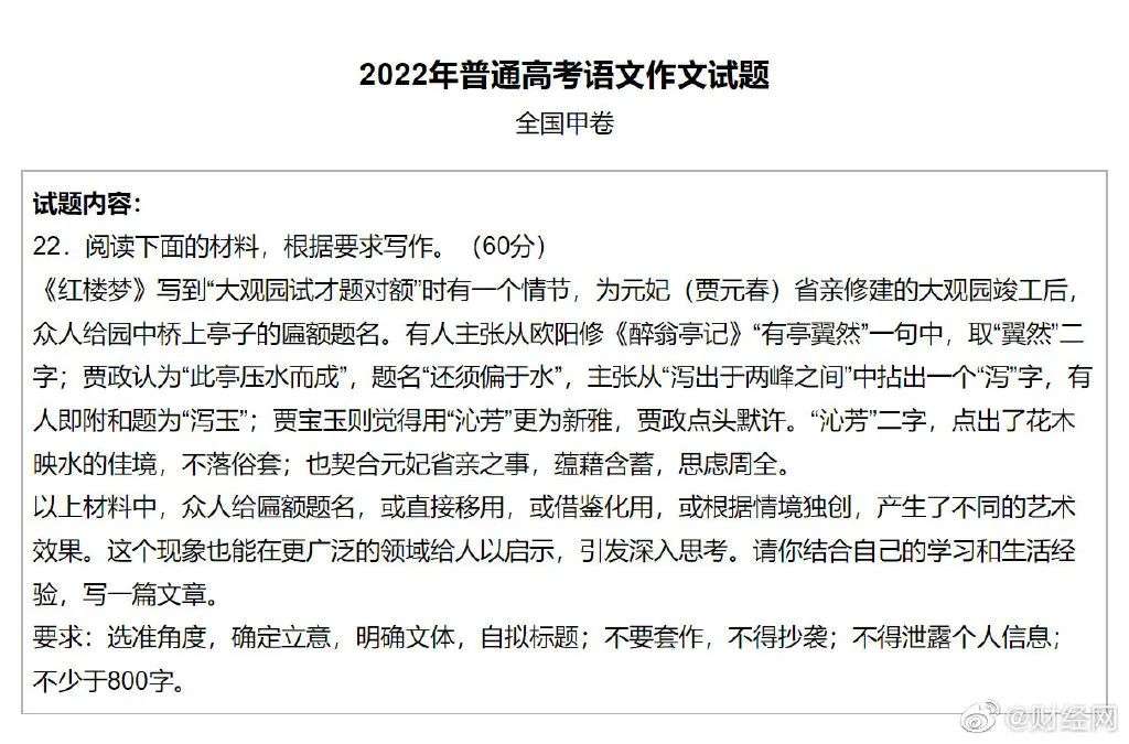 而其中最受关注的,还要数《2022年普通高考语文作文试题(全国甲卷)》的《红楼梦》考题,直接“难”上榜单。