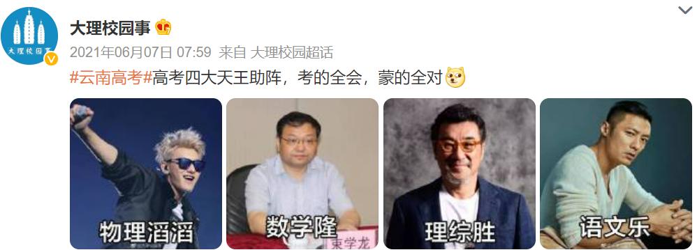 江湖上还有“高考四大天王”的传说,除了李宗盛还有:余文乐(语文乐),束学龙(数学隆),黄子韬(wuli韬韬,物理涛涛。)