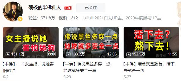 凭借“讨人喜欢”的能力——他总结的自己身上别人无法复刻的核心竞争力,半佛仙人微信公号在2019年上半年达到30万粉,5个月时间而已。到年底,粉丝突破60万。同年12月底,半佛仙人入驻B站,开号1个月就涨粉100万,1年突破400万,目前粉丝量已超过670万。