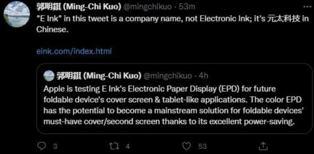 知名苹果分析师,郭明錤在推特上提到,苹果正在测试电子墨水屏,将用于折叠屏iPhone和iPhone等设备上,并且采取的是彩色电子墨水屏。