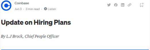 Coinbase在5月中旬开始就放慢招聘速度,以确保公司能够熬过在加密货币行业的这段低迷期。但从领英(LinkedIn)等社交媒体上的爆料来看,Coinbase 已经彻底冻结了新人招募,甚至波及到原本用于填补离职员工职务空缺的岗位应聘者,目前该公司也没有立即回应 TheVerge 等外媒的置评请求,尚不清楚 Coinbase 一共取消了多少工作机会。