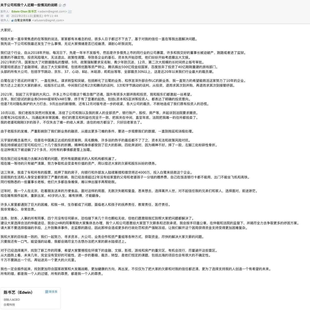 陈书艺在信中表示,眼下,只能等待破产清算,努力争取机会变卖有价值的资产,用来偿还大家的欠薪和股东纠纷的债务。