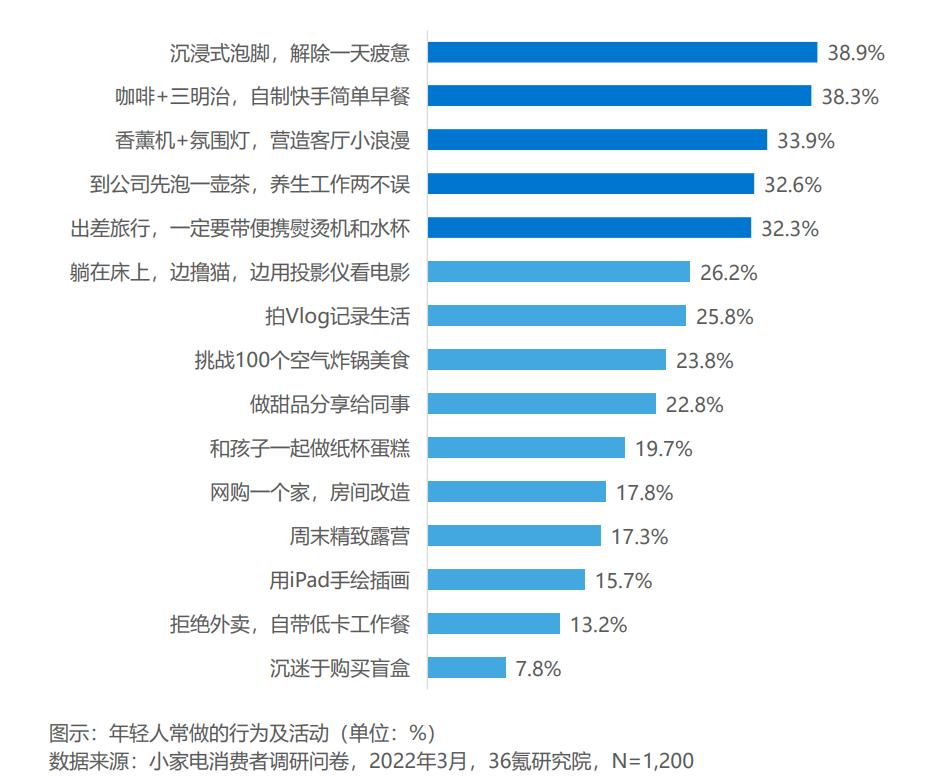 这种work life balance的体现,根据36氪研究院调研数据,年轻人最常取悦自身的Top5行为分别是泡脚、自制早餐、装饰客厅、在公司喝养生茶以及差旅自备熨烫机和水杯。这种balance意识背后其实还有更深一层的诱因,那就是年轻人愿为创意生活好物买单,创造力的好物只是手段,品质家居生活才是TA们的最终目的。
