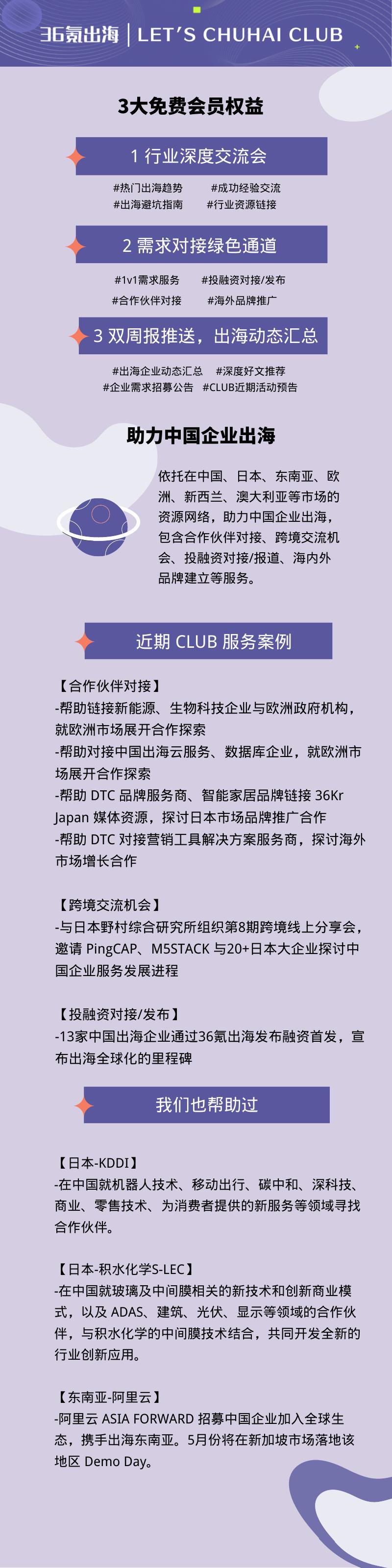 这个时代充斥着来自各方的信息,市场也每一刻都在变化,伴随而来的除了充满潜力的商业机遇,还有潜藏在风口中的危机与挑战。为了帮助企业决策者们更高效且精准地获取信息和链接行业资源,36氪出海于2021年创立 LET'S CHUHAI CLUB 社群(下称 CLUB),面向企业决策者、业务关键负责人进行招募,助力中国企业出海。
