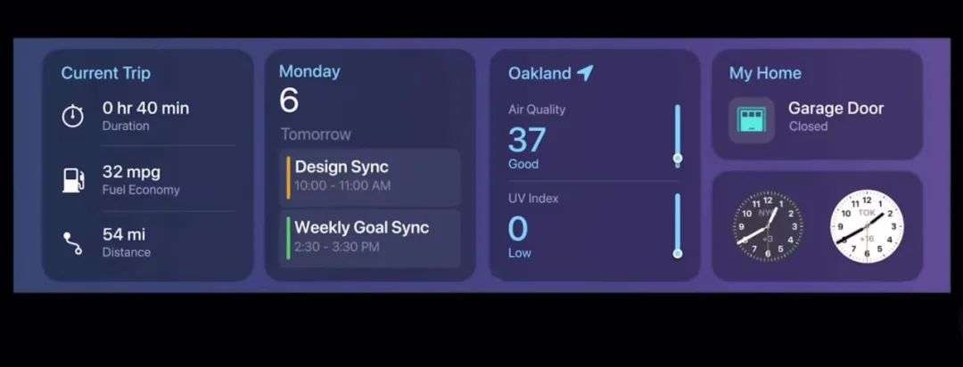在接管屏方面,由于这些年来车内的屏幕越来越多、越来越大,新版CarPlay也瞄准了车内所有的屏幕,包括了仪表屏、中控屏、副驾娱乐屏等等,不管是什么样尺寸的屏幕,CarPlay都能够支持,并且可以让iOS系统的各类小组件在车内不同的屏幕显示,如天气小组件等等。