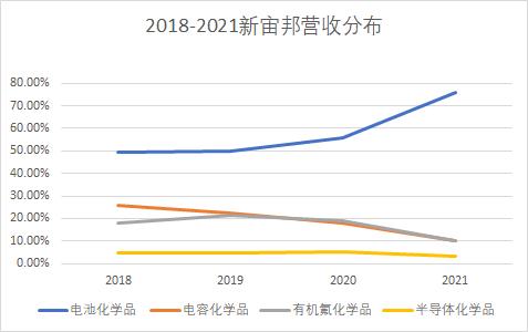近年来,新宙邦的有机氟化学品和半导体的营收占比呈现下降趋势,而原本是新宙邦发家之本的电容器化学品收入比重也在逐年下降。