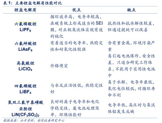 在锂盐的选择上,离子迁移率、溶解性、稳定性、钝化能力等都是需要考虑的问题,目前,六氟凭借着较高的循环效率、电导率等综合性能成为主流锂盐。