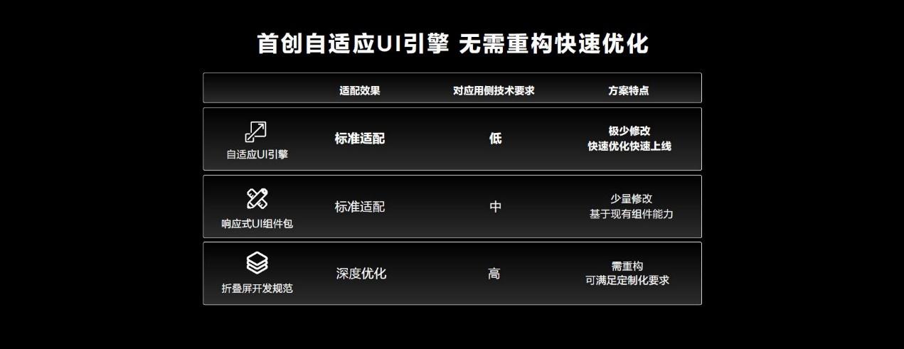 华为一直致力于与全球开发者展开深入合作,推动折叠屏应用生态建设,不断提升折叠屏手机用户体验。华为Mate Xs 2持续创新突破,首创自适应UI引擎,通过自学习获取原有布局信息,针对大屏显示重新优化布局,如文字从折叠态两行显示优化为展开态一行,重新排版布局、采用同色系元素智能填充、图片居中等方式让画面协调美观。而技术上,开发者无需重新开发,只需要简单的修改,就可快速优化快速上线,方便第三方应用接入。