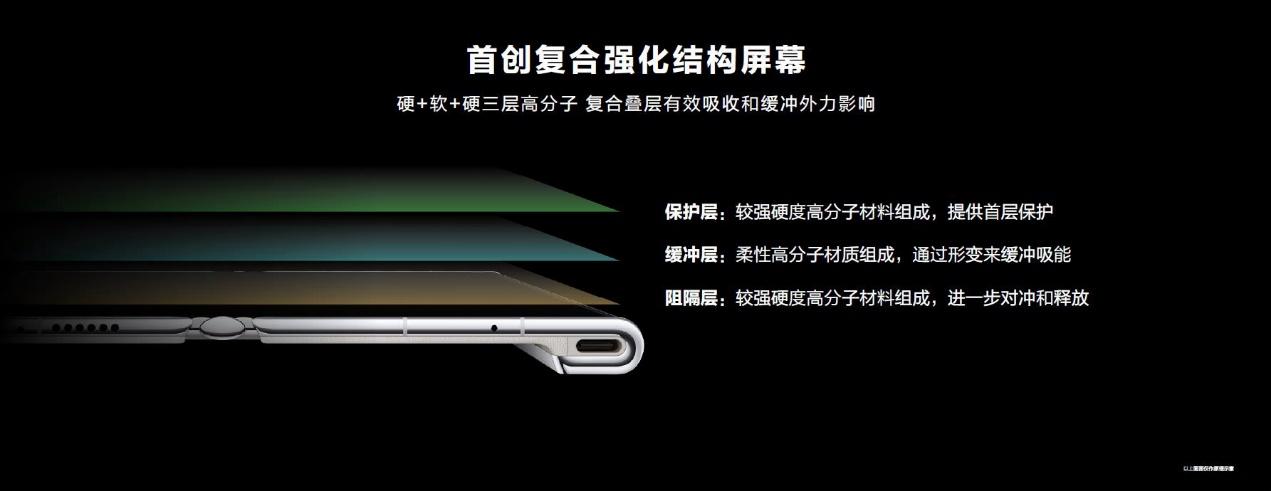 华为通过对屏幕的不同叠层方案进行微米级的精确仿真研究,采集千万量级可靠性大数据,精细化调优收敛最优方案,以找到不同材料的组合,最大化应对外力冲击,最终首创复合强化结构屏幕,使用“硬+软+硬”三层高分子复合叠层结构,形成“保护层+缓冲层+阻隔层”的三层结构,有效吸收和缓冲外力,更好地保护屏幕核心显示模组,从而确保屏幕的可靠耐用。