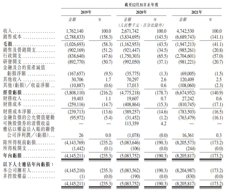 这直接导致威马增收不增利。招股书显示,在营收方面,威马汽车实现了不断增长,连续三年的收入分别为 17.62 亿元、26.72 亿元、47.43 亿元,同比增长 51.6% 和 77.5%。