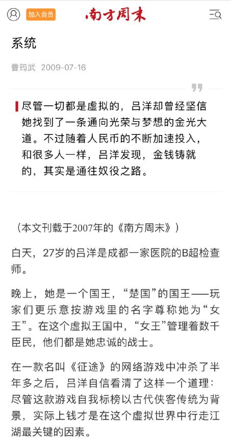 随着2006年《征途》上线将网游从时间付费转向道具付费,玩家群体迅速扩大,游戏体验则变得与以往大为不同。在道具付费模式下,游戏的公平性不再有保障,免费玩家只有被氪金付费玩家按在地上摩擦的份。2007年《南方周末》那一篇关于《征途》的特稿更是让“系统”这个概念第一次破出了圈。