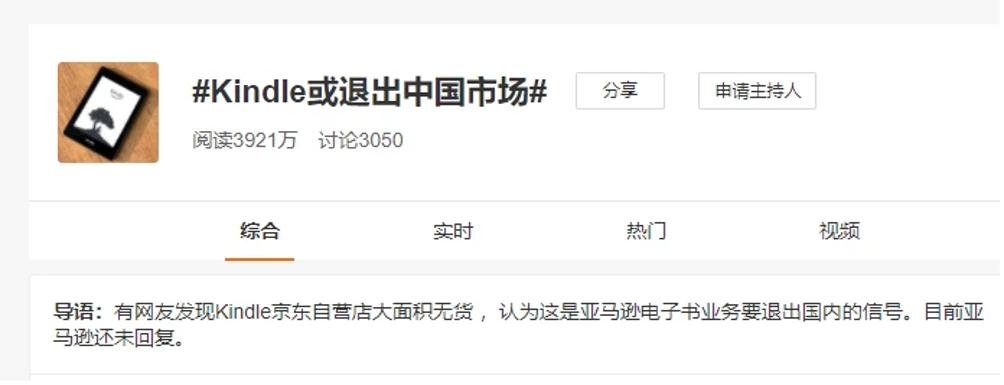 2022年1月,Kindle京东官方直营店大面积缺货。1月4日上午,“Kindle退出中国市场”的消息冲上微博热搜榜首,众多网友在“Kindle中国”官方微博账号下询问相关消息的真实性。