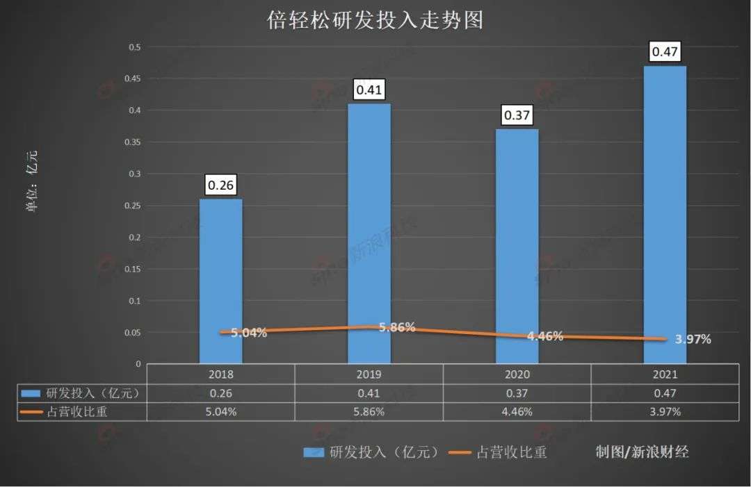 形成鲜明对比的是,倍轻松2018年-2021年的研发费用分别为2557.80万元、4065.67万元、3689.12万元和4720.50万元,占同期营收的比重分别为5.04%、5.86%、4.46%和3.97%。