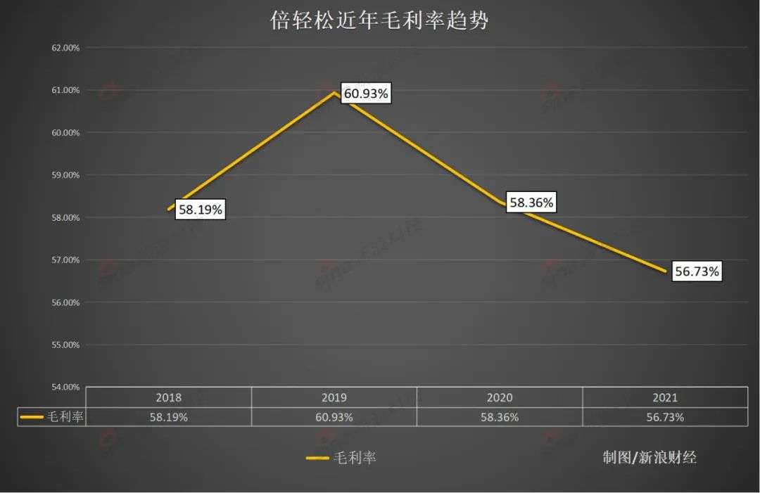 不过一个悖论是,线上渠道既拯救了倍轻松在线下门店上的损失,但同时也带来了一个新的问题。线上用户更加注重性价比,对价格更为敏感,因此倍轻松在开拓线上渠道的同时,其毛利率也一直处于下降态势。