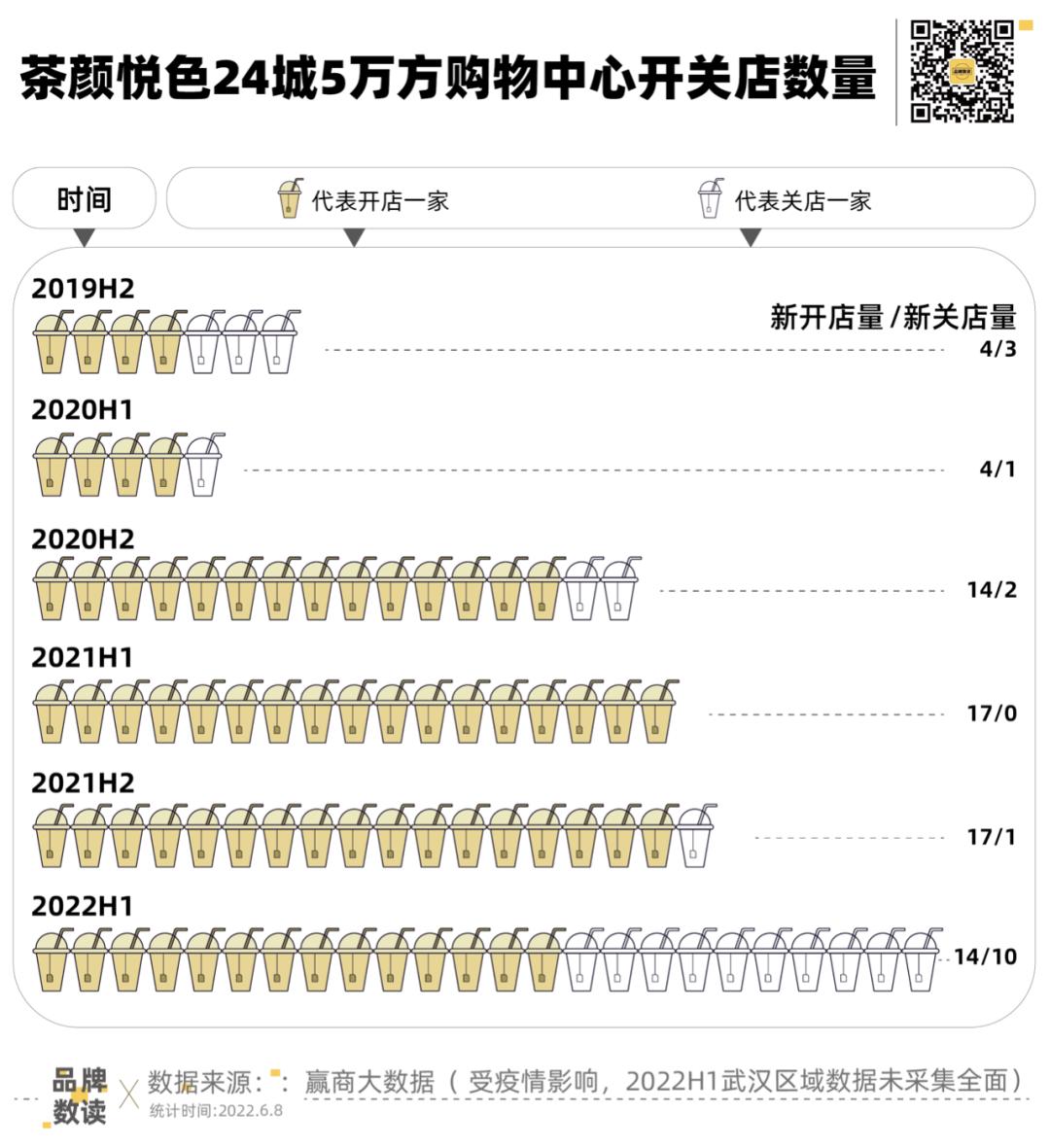 而与之对应的则是购物中心门店数的新一轮收缩。根据赢商大数据不完全统计,茶颜悦色今年上半年在长沙24城5万方购物中心中的门店数锐减10家。