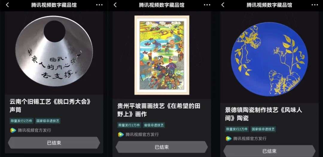 这三款藏品均分别发行2万件,和“福小虎”一样只要参与平台活动或者是相关会员都可以免费领取。思路很大程度上和优酷一样,是腾讯系形成声量在新年期间整体输出,所传达的内容也和此前强调传统文化传播的发力要点一致。
