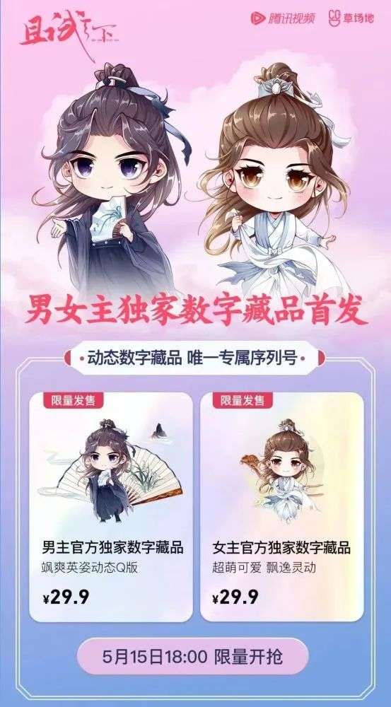 5月15日,腾讯视频发布了电视剧《且试天下》中的人物角色Q版形象数字藏品。这也成为最近比较受人瞩目的数字藏品动态。其中,《且试天下》的两款人物形象藏品各发布了2500件,定价29.8元;《新游记》藏品发布6x6000件,定价19.8元。