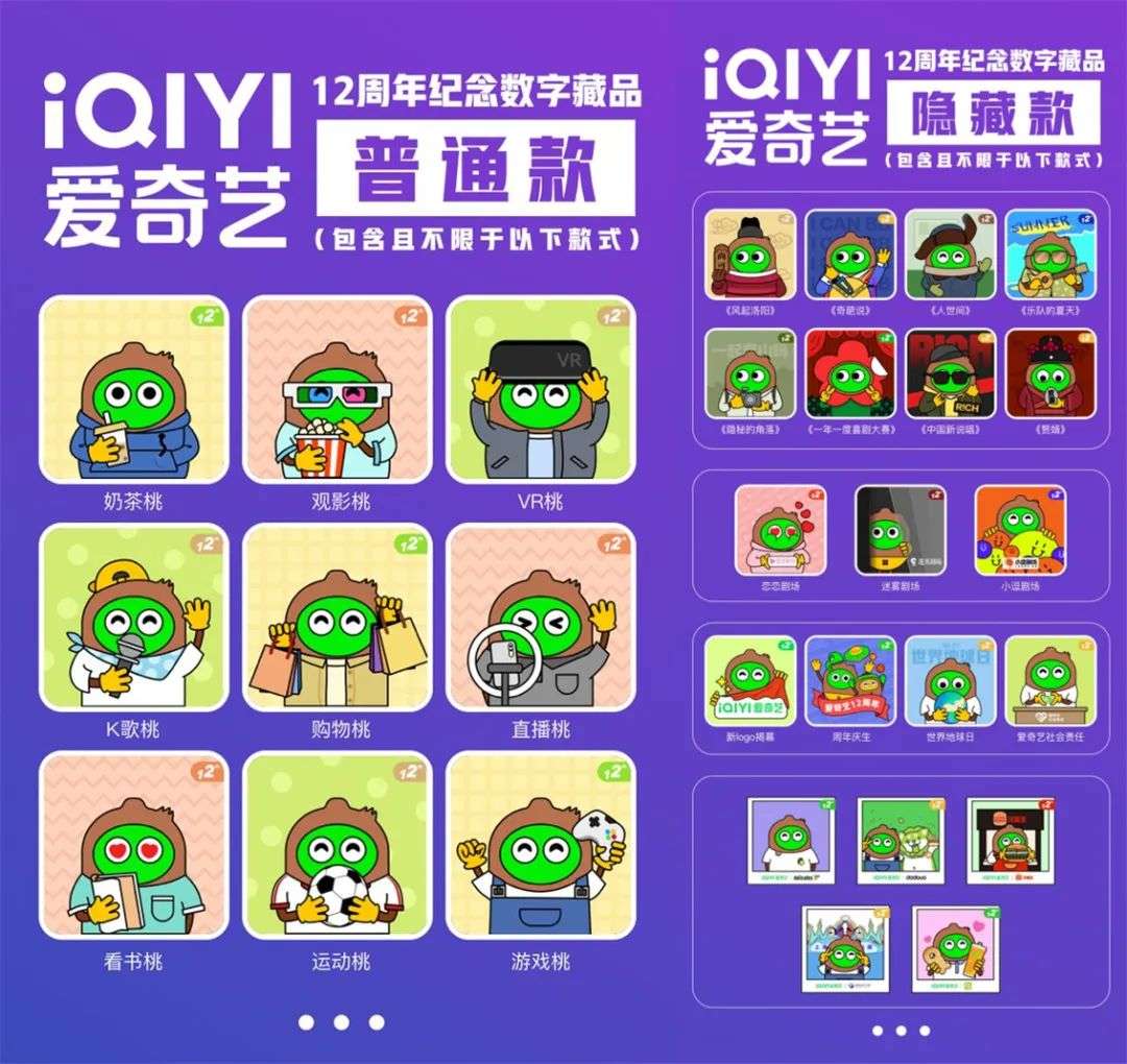 潮玩类内容一是结合了随刻积累的平台热度,二是也与平台发力潮流文化的风向一致。今年12周年庆推出的数字藏品,就以不同爱奇艺萌物猕猴桃kiki形象发布,共计12000枚。今年4月则发布了Producer C熊猫头的数字藏品盲盒,共计8888份。