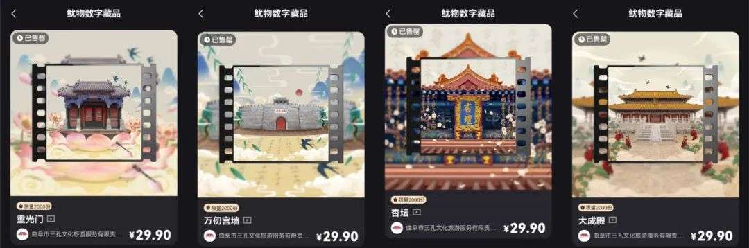 优酷的“鱿物”平台虽然上线刚刚半个月,但已经发布了四轮内容:5月18日起三天发布了三款“非遗缂丝”系列藏品,售价19.9元,分别发行2000份;随后发布了七款“富春山居图”系列数字藏品,单款限量6666份,售价29.9元;近期发布的“三孔”系列产品、杨德全蜀绣系列也已售罄。