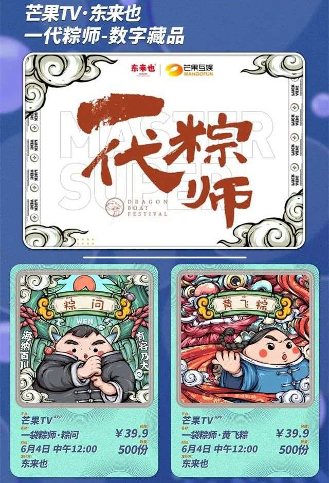 今年端午,芒果TV刚刚发布了“一代粽师”系列的数字藏品,分两天发布共四款各500份产品,定价39.9元,目前已经全部售罄。