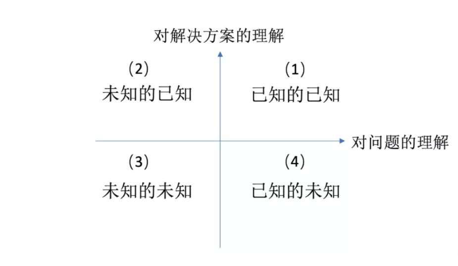 香港中文大学商学院终身教授张晓泉认为,思维可以分为“已知的已知”、“已知的未知”、“未知的已知”和“未知的未知”四种。