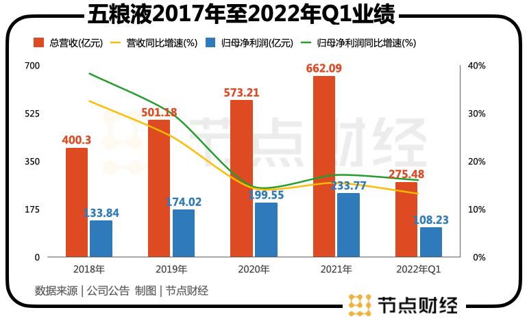 到了今年一季度,增速放缓的状况仍在持续。财报显示,2022年Q1,五粮液营收增速为13.25%,归母净利润增速为16.08%。相比之下,茅台、泸州老窖同期的表现分别为18.25%、23.58%和26.15%、32.72%。差距一目了然,也难怪财报一出,股价就应声下跌。