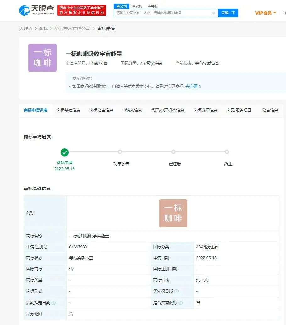 据工商信息显示,近日,华为技术有限公司申请注册“一标咖啡吸收宇宙能量”商标,国际分类为餐饮住宿,当前商标状态为等待实质审查。