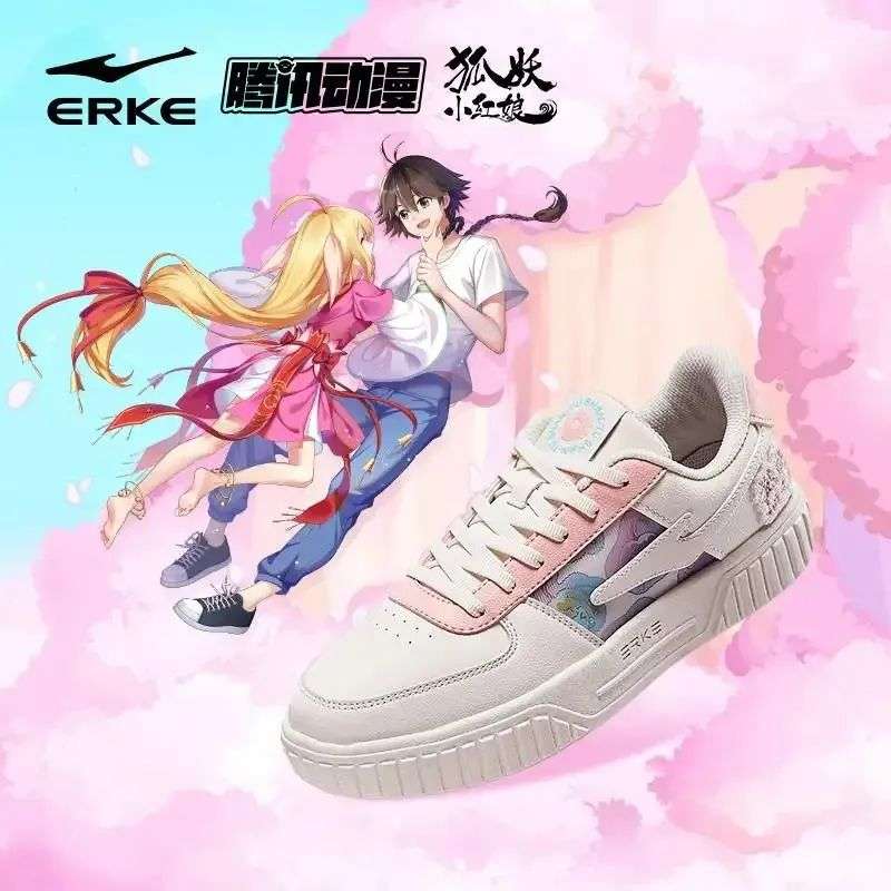 鸿星尔克与《狐妖小红娘》联名的板鞋,是直接将涂山苏苏与白月初的Q版印在鞋侧帮上,白色搭配淡蓝、淡粉的配色非常少女心。