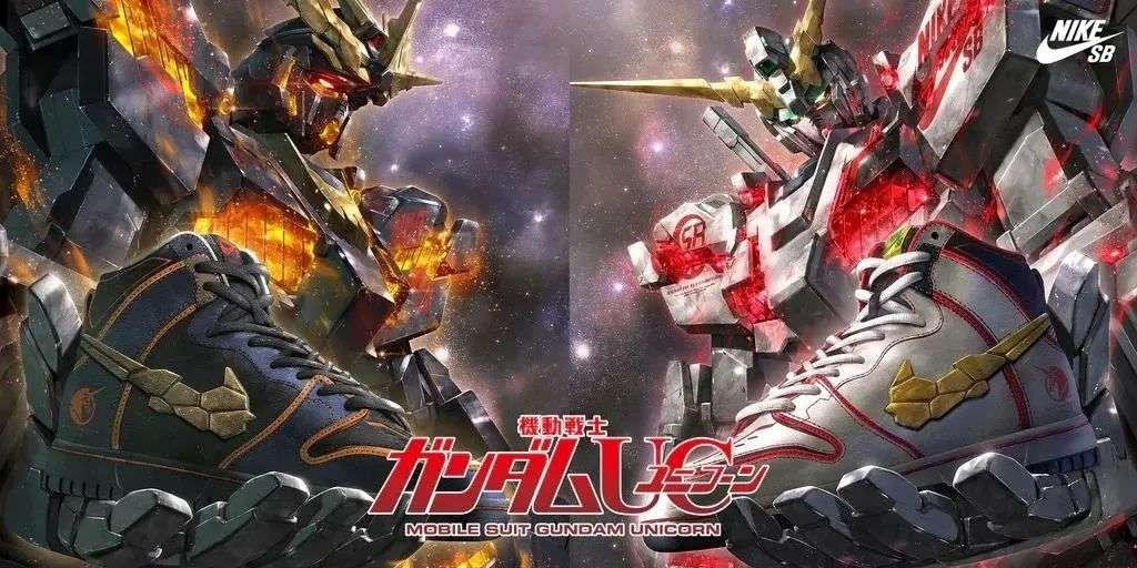 2003年,Nike曾推出过以阿姆罗、夏亚配色为设计灵感的Nike VC2 以及 Nike Air Max Uptempo。2021年,Nike与高达又一次联名,推出高达x Nike Dunk SB,除了配色还原,还将独角兽和报丧女妖的标志性机体元素通过魔术贴融入到鞋子设计中,相较于2003年的联名款,在外观设计上更符合高达迷的口味。