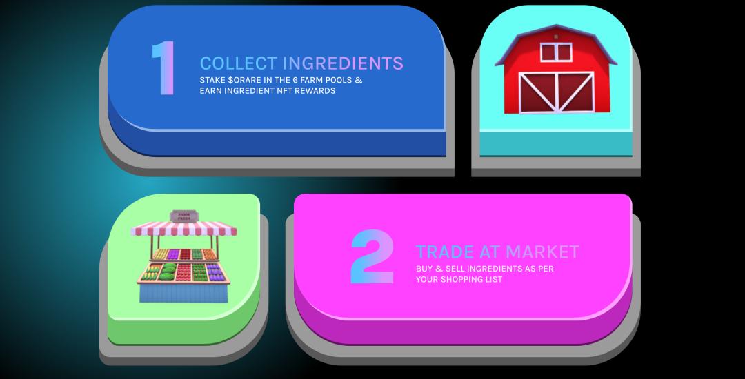 在农场中,用户可以从六个主题池中进行选择并质押他们的代币,这将产生洋葱、番茄和生菜等蔬菜原料NFT。这些NFT既可以在农贸市场出售,也可以直接用于在厨房里做菜。