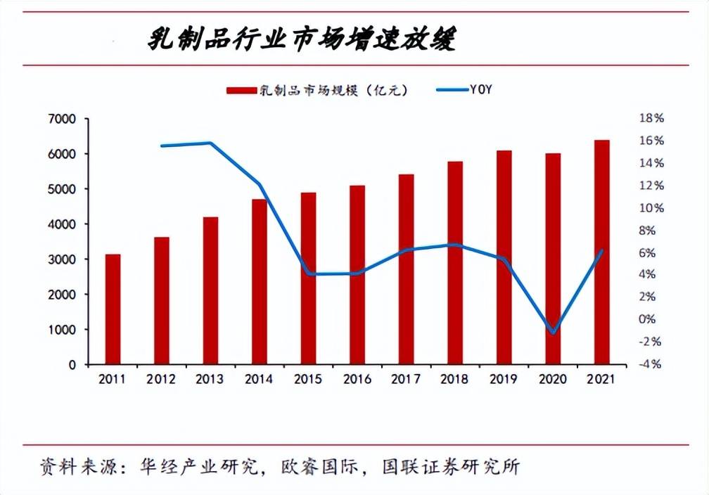 从行业规模来看,据资料显示,目前乳制品行业正从增量转向存量竞争,我国乳制品行业2015年规模为4896亿元,行业增速见顶,之后增速逐年下滑,从量增驱动转向价增驱动。根据欧睿国际数据,2021年我国乳制品行业规模为6387.57亿元,同比2020年回升6.18%,行业整体规模较2011年的3136亿元增长近一倍。
