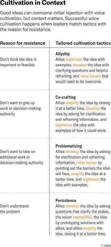 在这样的情况下,领导者参与团队共同提出问题对于促进和共同解决问题的机会至关重要。在下表中,《哈佛商业评论》建议了一些策略分组 - 盟友关系,共同制定,问题化和持久性 - 可以响应特定形式的抵抗。