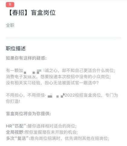 此后一场“盲盒岗位文案大赛”在全网自发启动,北京、重庆、广东、江苏等地的公司都有参与,而他们的主打信息都是“想找工作却不知道自己适合什么岗位”。