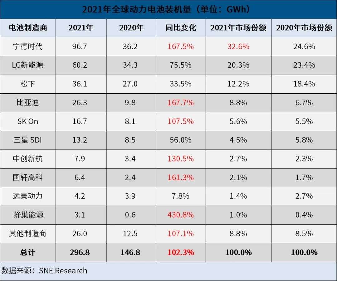 据韩国市场研究机构SNE Research公布的数据显示,2021年全球动力电池装机量排行榜,前十名分别为宁德时代、LG新能源、松下、比亚迪、SK On、三星SDI、中创新航(中航锂电)、国轩高科、远景动力、蜂巢能源。