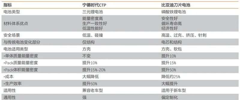 例如在电池工艺上,比亚迪和宁德时代分别推出了CTP和刀片电池。