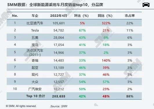反观比亚迪,电池主要靠自供,整车生产基地也分散在全国各地,受上海疫情的影响较小。因此得以在4月逆势狂卖10.6万辆车,不仅超过特斯拉登顶全球新能源车销量冠军,也助其磷酸铁锂装车量占比反超宁德时代,高达47.14%。
