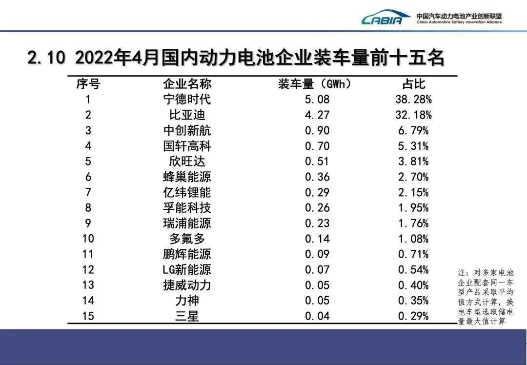 4月,宁德时代动力电池装车量市占率出现较大幅度下滑,降至38.28%。与此相对的,比亚迪的市占率相比3月提升12.94个百分点至32.18%,两者市占率仅差6.1个百分点。