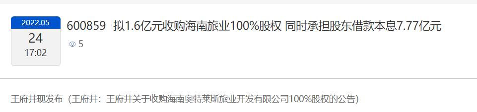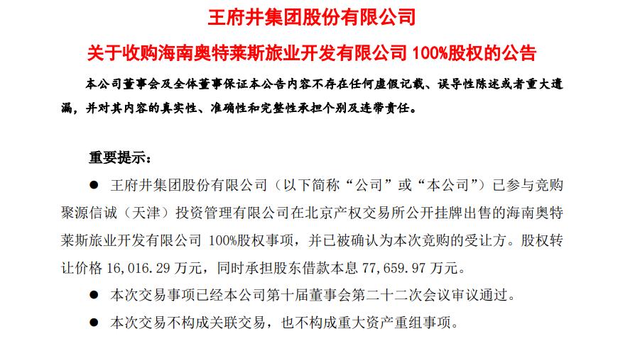 5月25日,王府井发布公告称,公司通过参与竞购的方式,获得聚源信诚(天津)投资管理有限公司(以下简称“聚源信诚”)在北京产权交易所公开挂牌出售的海南旅业100%股权。股权转让价格1.6亿元,同时承担股东借款本息7.77亿元。