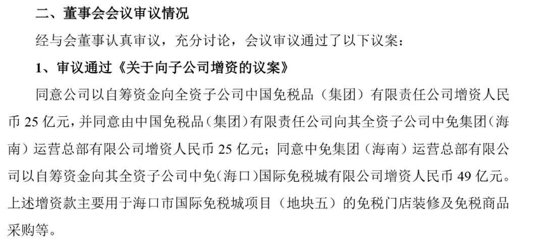6月8日,中国中免发布公告称,经董事会审议拟增资用于海口市国际免税城项目(地块五)的免税门店装修及免税商品采购等。