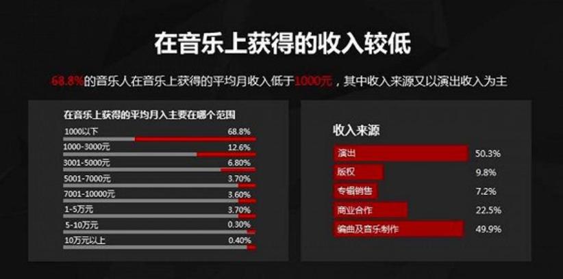 热闹之外,根据2016年网易云发布的《中国独立音乐人生存现状报告》显示,在音乐上获得的平均月收入在1000元以下的音乐人占68.8%。那一年,各一线城市的最低工资标准都达到了1700元。大多数音乐人在音乐上的收入不如普通打工族的工资。