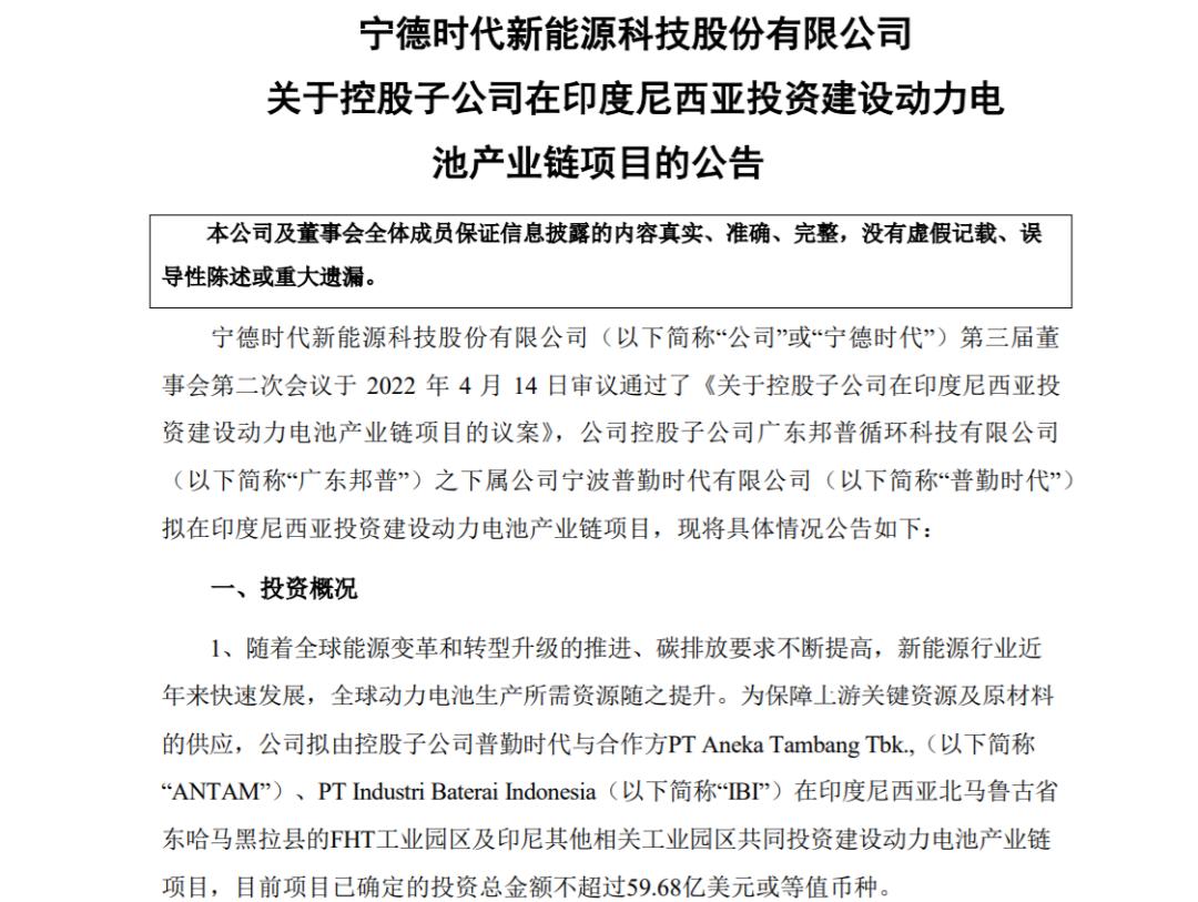 宁德时代在镍资源上有布局。今年4月15日,宁德时代发布公告显示,公司董事会于4月14日审议通过了子公司拟在印尼与三方合作投资动力电池产业链项目,总投资金额不超过59.68亿美元,其中宁德时代计划投资总金额约为39.37亿美元。