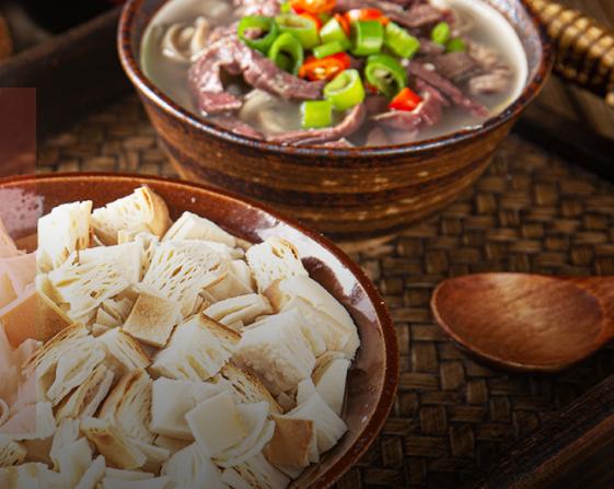 甘肃陇东南吃的羊肉泡馍,将配好食材,再用羊肉汤浇三遍,剔除过多配料包括糖蒜和辣酱,只留下粉条和豆腐,这便是制作形式和用料上双创新。