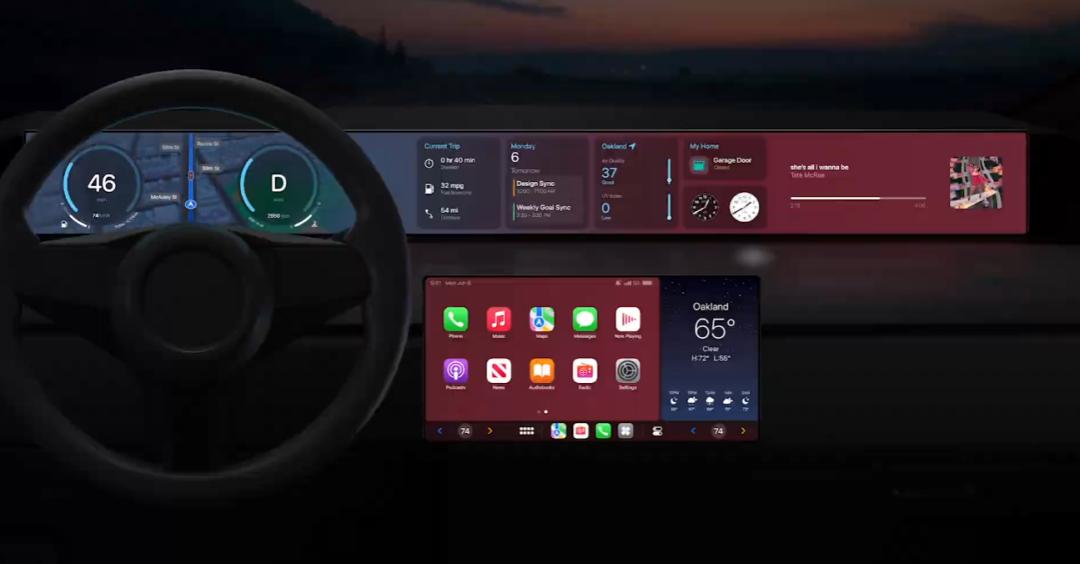而在本周的 WWDC 上,苹果给我们预览了一个正在开发中的全新版 CarPlay 系统,最快在明年下半年就能对车企开放。 这个新版 CarPlay 最厉害之处在于:除了中控娱乐系统的屏幕之外,它还能够接管汽车的仪表盘,以及车内更多的屏幕。