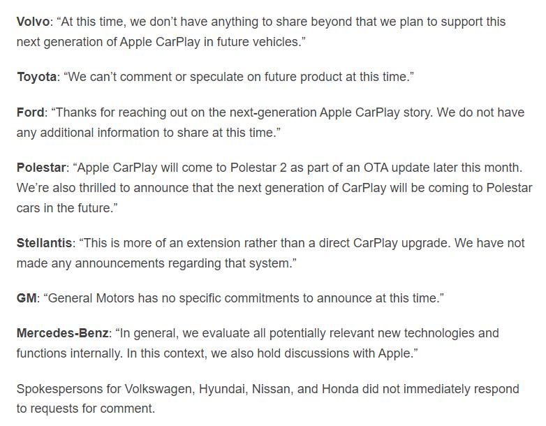更搞笑的是,科技媒体 The Verge 在会后联系了一圈已经支持了 CarPlay 功能的车企,包括在 WWDC 幻灯片里有 logo 露出的。结果,一部分车企都表示目前对多屏支持没有计划,另一部分车企则表示对未来计划不置可否——和2019年没什么两样啊。