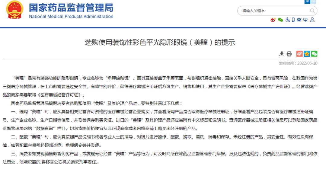 6月10日,国家药监局发布了名为《选购使用装饰性彩色平光隐形眼镜(美瞳)的提示》的科普文章,明确表示,美瞳在我国作为第三类医疗器械,应按要求严格监管。