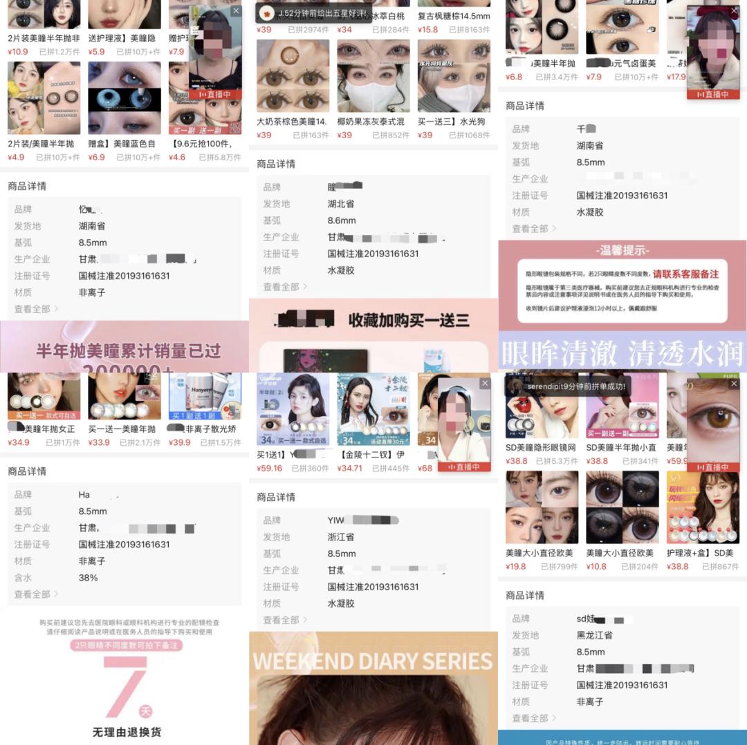 青眼在拼多多上搜索美瞳产品,发现有6个品牌的一款产品均使用同一个注册证号,即国械注准20193161631,当青眼向客服索要资质凭证时,对方表示以详情页为准。经调查,其中有2个商标属于同一家企业。而这些产品价格在15-60元不等,销量最好的已拼超过10万单。